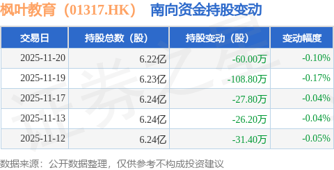 证券之星消息,11月20日南向资金减持60.0万股枫叶教育(01317.HK)。近5个交易日中,获南向资金减持的有5天,累计净减持254.2万股。近20个交易日中,获南向资金减持的有20天,累计净减持559.8万股。截至目前,南向资金持有枫叶教育(01317.HK)6.22亿股,占公司已发行普通股的21.21%。
