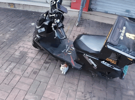 小猫落地后,慢悠悠地走到他的电动车旁,钻进了车底阴影里,却没有离开,它坐在那里,尾巴盘在脚边,依旧望着他。