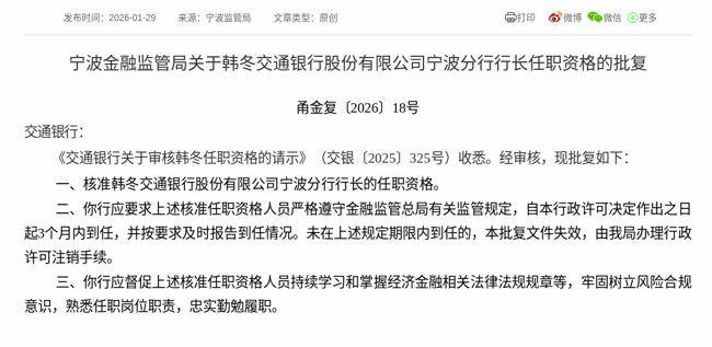 2026年1月29日,根据国家金融监督管理总局消息,《交通银行关于审核韩冬任职资格的请示》获得通过,批复韩冬交通银行股份有限公司宁波分行行长的任职资格。