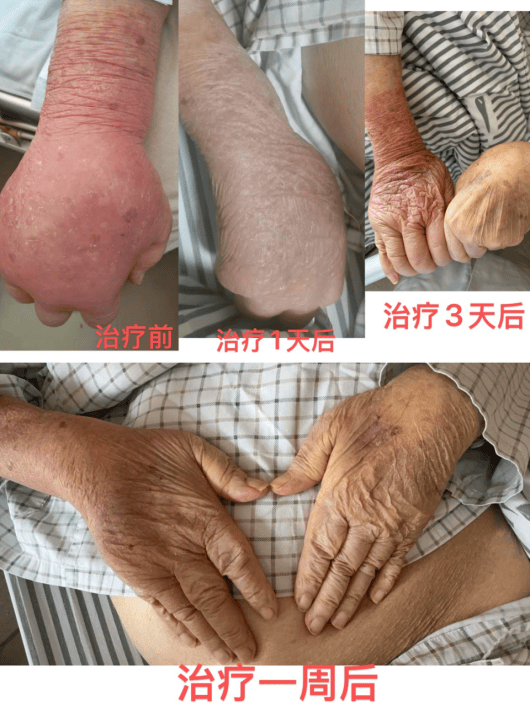 由于陆爷爷属于高龄老人,患有糖尿病、高血压、系统性红斑狼疮等多种基础疾病,入院后检查发现陆爷爷已发展成慢性肾脏病5期——也就是尿毒症了。理论上来讲,血液透析是替代爷爷肾脏排水排毒的最好方法,但是由于爷爷年龄太大,家属还是坚持非透析治疗。肾内科全体医生经过讨论,决定先采用改善肾脏循环,利用好残余肾功能,再提高爷爷的血浆胶体渗透压浓度,把皮下水肿的水引到血管里,然后再通过利尿排掉多余的水分,由于局部还伴有感染,所以也有针对性的使用了抗菌药物。治疗一天后,陆爷爷的手部水肿就消退了很多,从原来的肿胀发亮到出现了皱褶,疼痛也减轻了;治疗三天后,右手水肿基本消退了,就是局部还有点发红;治疗一周后,爷爷手肿已经恢复正常,两只手放在一起已经没有两样了。爷爷很满意,说腰还有点疼,让医生继续帮他治治。近日,爷爷病情已经缓解,准备回护理院继续过他快乐的晚年生活了。