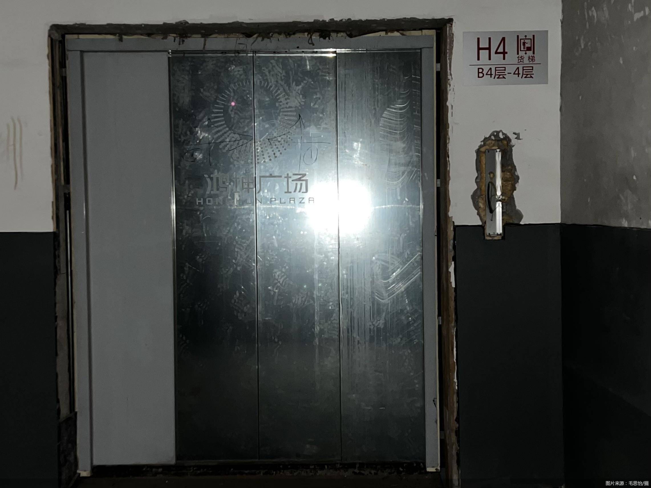 1月28日当天,距离永辉超市最近的鸿坤广场4号门关闭落锁,人员无法通行。4号门位于鸿坤广场一层外侧临街位置,门头带有永辉超市标识。该门是消费者进入的主要入口,消费者可直接乘坐扶梯从一层前往位于B1层的永辉超市。当天,B1层货梯的电梯按钮也处于被拆除状态。
