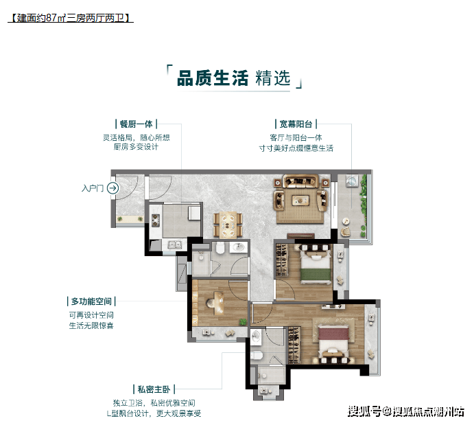 划重点,区别于市场上70㎡+多为“2+1”房的擦边球户型,振业学府里的75㎡户型可以实现真正有尺度感的三房。