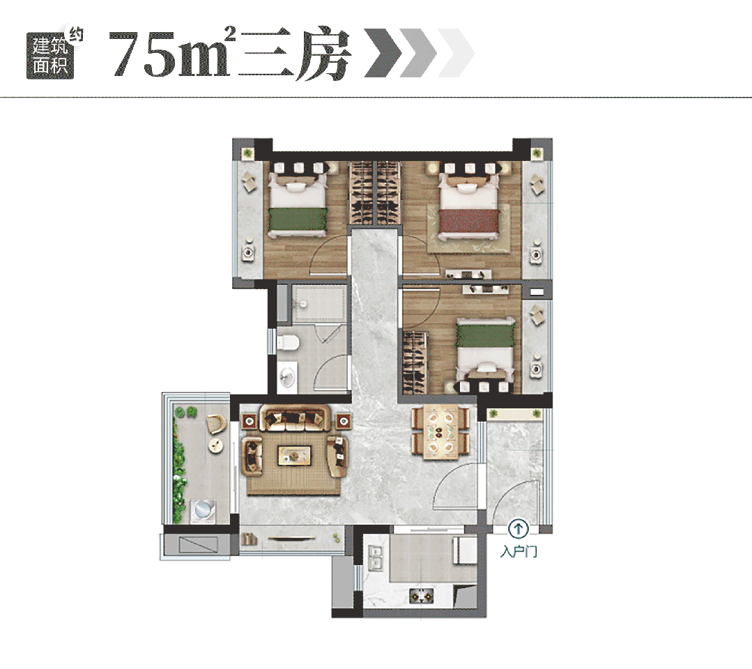 75㎡三房,项目做出了新塘唯一的单边位设计,保证了南北对流和360°景观视野。