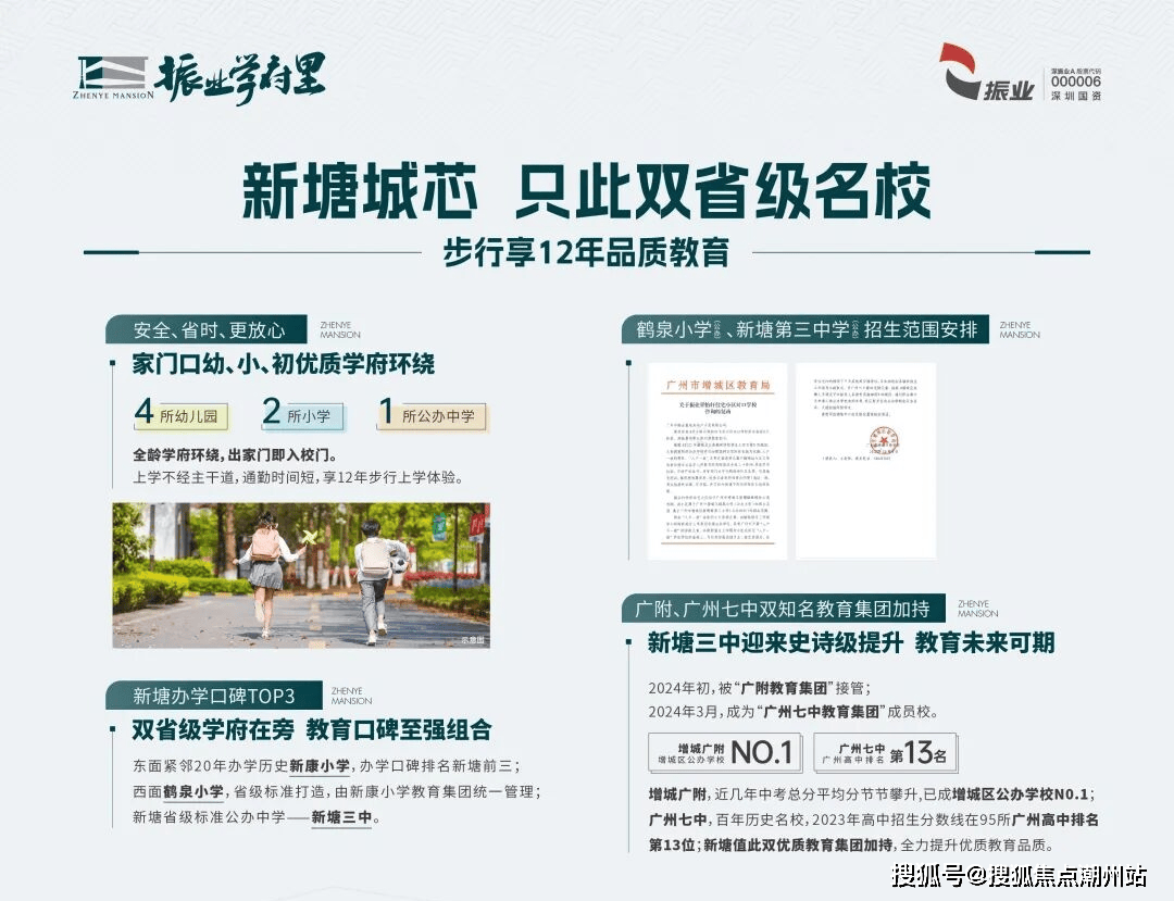 项目紧邻着的新康小学和鹤泉小学均由新康小学教育集团统一管理。前者已有超20年办学历史,是全新塘办学口碑排名前三的老牌私立小学;后者则按照省级标准打造,都是当之无愧的“实力派”。目前对口的中学是新塘三中,新塘三中来头更是不小,作为省级标准公办中学,今年初已被增城广附接管,3月份更是成为广州七中的成员校,拥有了双名优教育集团的加持。