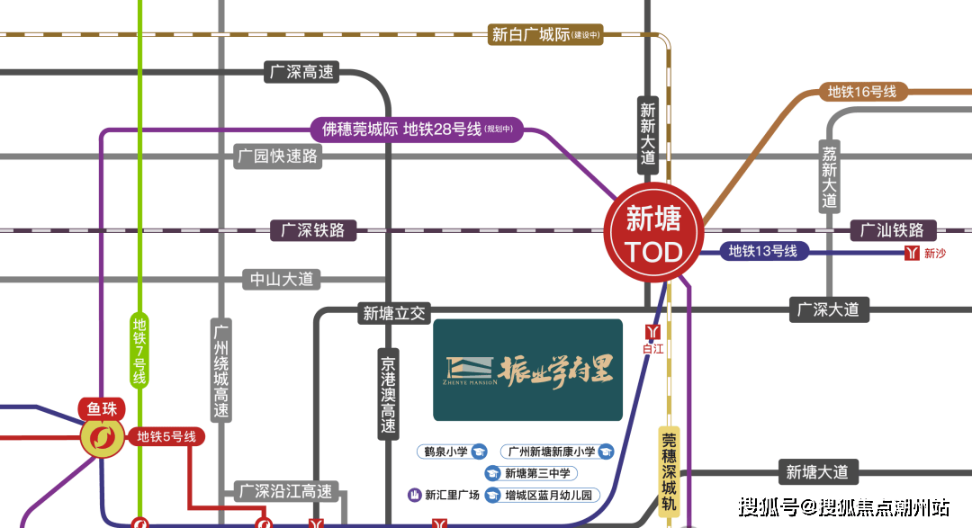 地铁——现成的广州地铁13号线沙村站和白江站之间,1站黄埔,7站天河,二期未来13站直达珠江新城,后期规划有16号线/20号线/23号线/28号线等地铁线;一站到新塘,有两城轨(穗莞深城轨、新白广城轨)、两高铁(广深铁路、广汕铁路),可快速穿梭广州、东莞、深圳等连通省际及2大国际机场,迅达湾区核心城市圈;