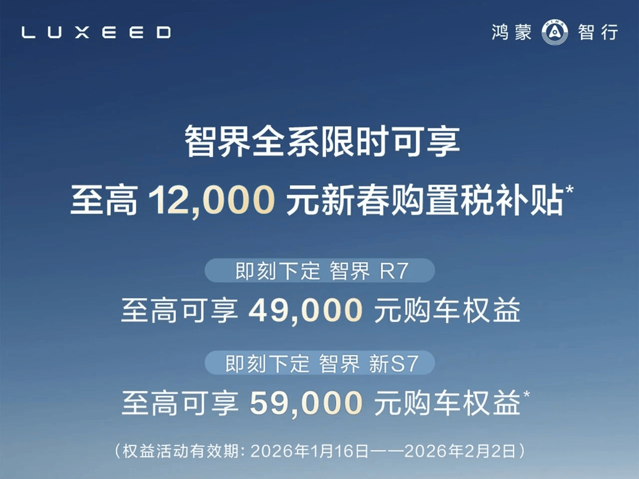 鸿蒙智行旗下的智界R7与智界S7全系车型可享受至高1.2万的购置税补贴,截止时间2月2日;