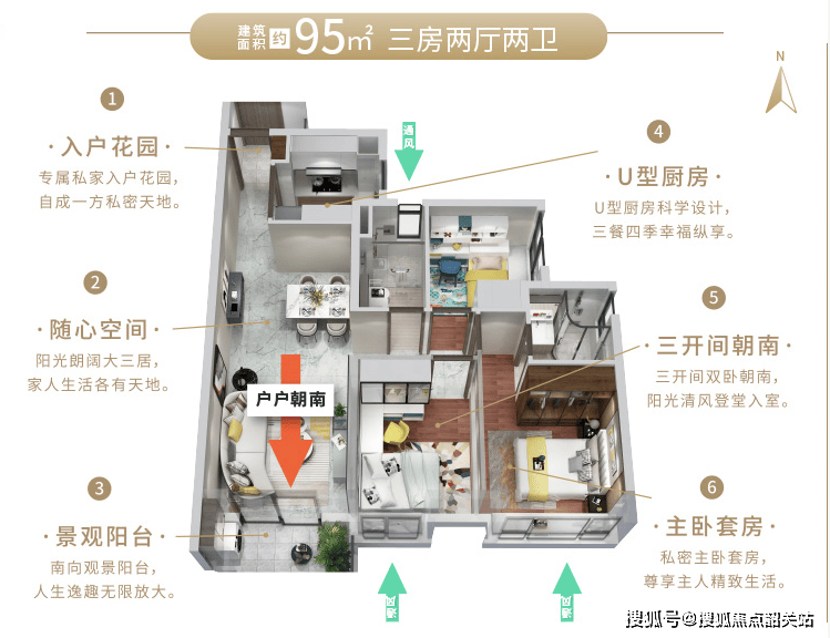 主力产品里,建面约95㎡的全南向三房让我印象深刻。三开间朝南,客厅连通阳台,厨房与餐厅开放式衔接,小户型也能做出通透感。更实用的是入户处设计了一个私家花园式玄关,既能放鞋柜、雨伞,又起到缓冲隐私的作用。对于首次置业或小家庭来说,这种“不浪费一平米”的布局很加分。