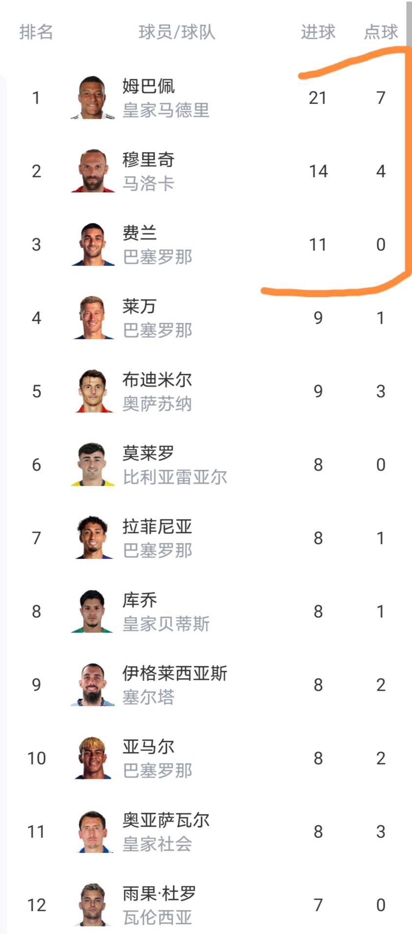 射手榜上姆巴佩、穆里奇、费兰他们三个进球上双,姆巴佩较大优势领跑。