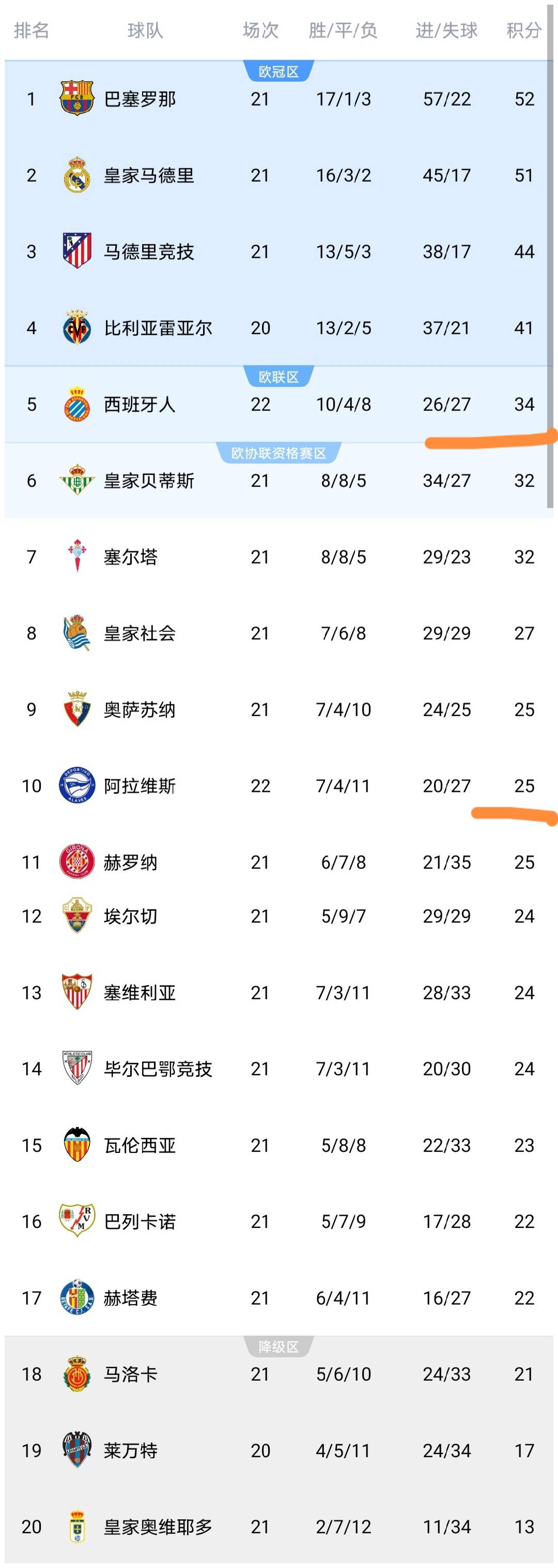 可以看到西班牙人队遭逆转之后,积分停留在了34分,依然排名第5,但是落后第4的比利亚雷亚尔队7分,而且比第4的比利亚雷亚尔队多赛2场,可以说西班牙人队基本没啥希望争夺到欧冠席位了,而且多赛一场仅领先第6的皇家贝蒂斯队2分,这显然是天助皇家贝蒂斯队,安东尼领衔的皇家贝蒂斯队显然看到了反超西班牙人升至欧联席位区的希望。而阿拉维斯赛后积分上涨到了25分,已经远离了降级区。