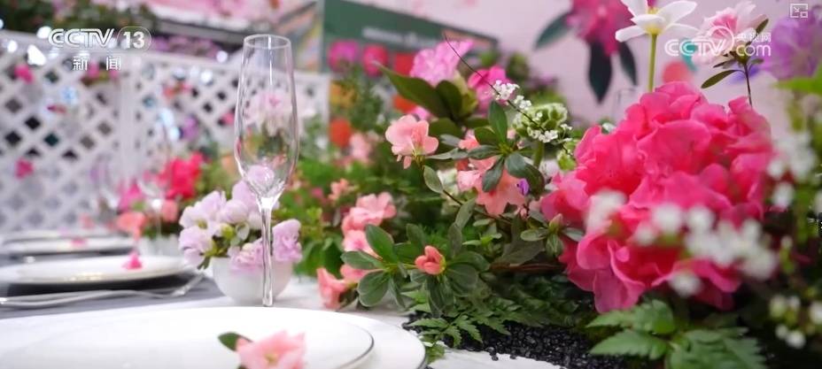 这个餐桌并不是在一家餐厅,而是在北京花卉交易中心的一个花卉展台上。这些花儿是来自2000多公里外的贵州高山杜鹃。以前我们看到的高山杜鹃经常是在花盆里或者花园里,现在以插花和桌花的形式,成为餐台上一道亮丽的风景。
