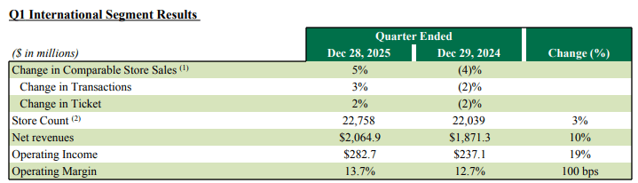 财报显示,2026财年第一季度(2025年9月29日-12月28日),星巴克营业收入99亿美元,增长5%;归母净利润2.93亿美元,同比下降62.44%;全球新增了128家咖啡馆,营业利润率为10.1%。