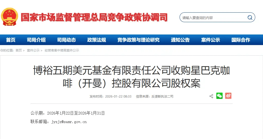 在最新的业绩交流会上,星巴克首席财务官凯茜·史密斯表示“预计交易将在今年春季完成,具体取决于监管审批。”根据国家市场监督管理总局公示,博裕五期美元基金有限责任公司收购星巴克咖啡(开曼)控股有限公司股权案,公示期将于2026年1月31日结束。