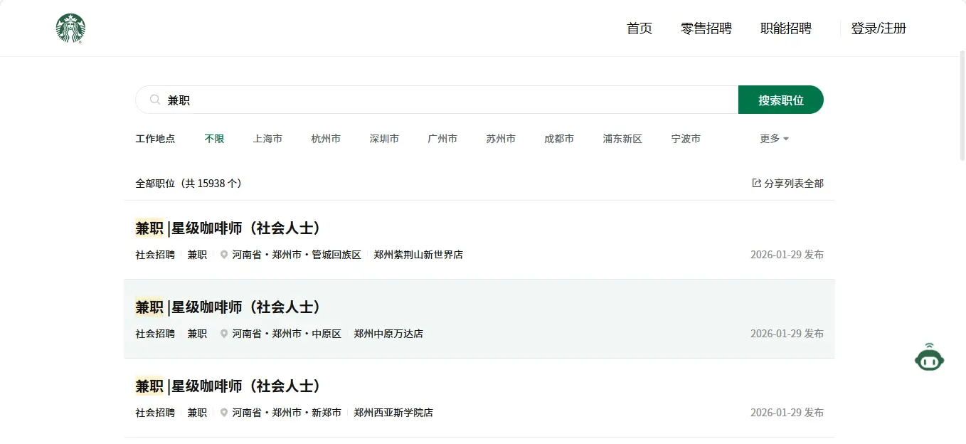 从财报上看,星巴克中国仍保持着良好的两位数利润率,其中有其运营方式调整的影响。搜狐美食发现,截至1月30日,星巴克招聘官网零售门店兼职岗位(共15938个)已占全部招聘岗位(共25461个)的62.6%。