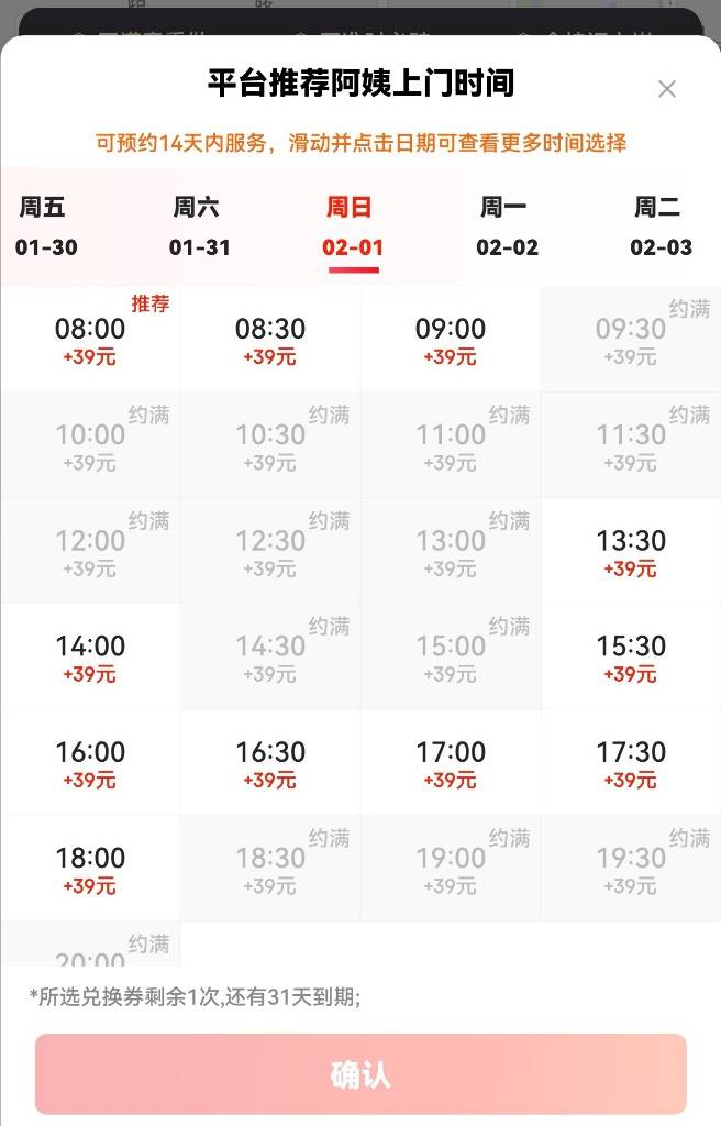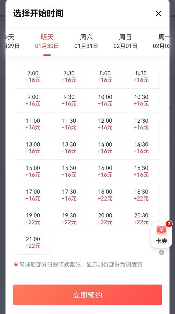 例如,在天鹅到家昆明区域的预约页面中,记者发现:1月30日前,2小时保洁的白天时段需加收16元服务费;1月31日起,加收费用上调至20元。随着保洁时长增加,加价幅度也相应提高。京东家政的2小时保洁在2月1日则统一加收39元,同时平台显示多个时段已约满。