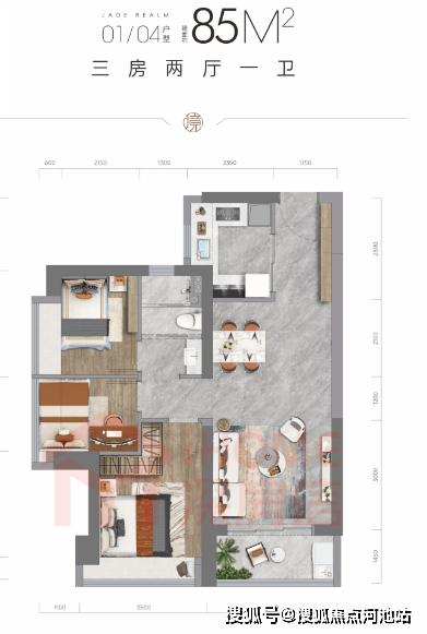 85㎡的3房2厅1卫,设计的是竖厅格局,进门入户玄关,客厅3.6米开间,LDKB一体化设计,动静分区,U型厨房,卫生间三段式分离,得房率约75.4%(不含赠送),西南或东南朝向。