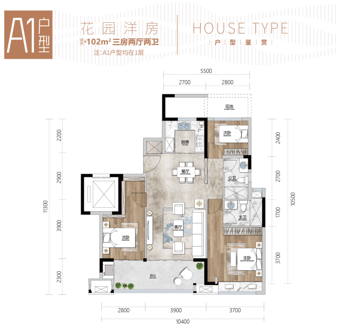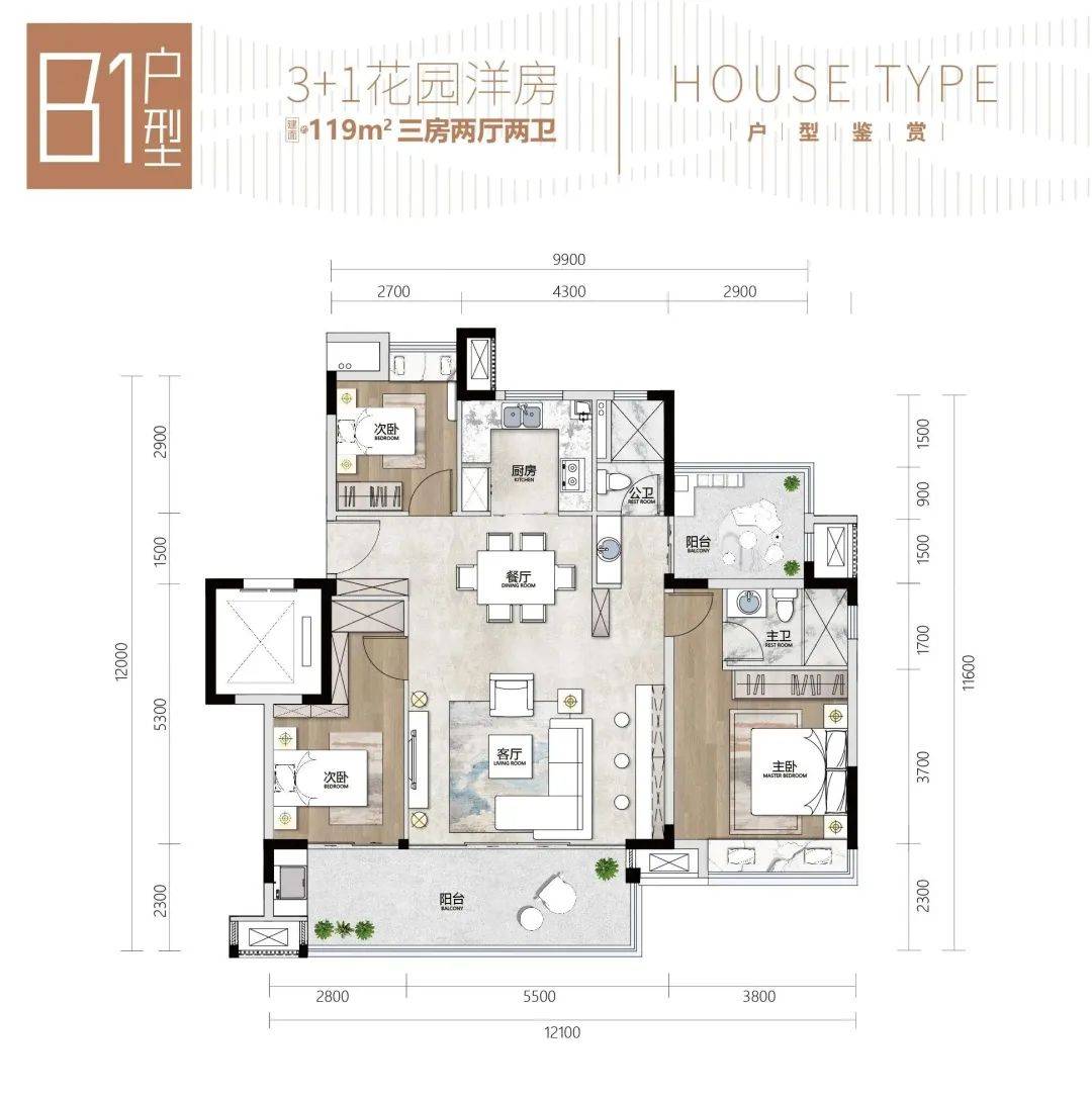 A户型:建筑面积约108㎡,3+1房2厅2卫。布局紧凑,南北通透;入户式玄关设计,保证户内隐私,户型方正,可变性强;客餐一体,空间开阔明朗;前后通透,双阳台设计,包揽别样美景;拖拉门明厨,双灶台设计;南向主卧,独立卫浴,带超大飘窗。