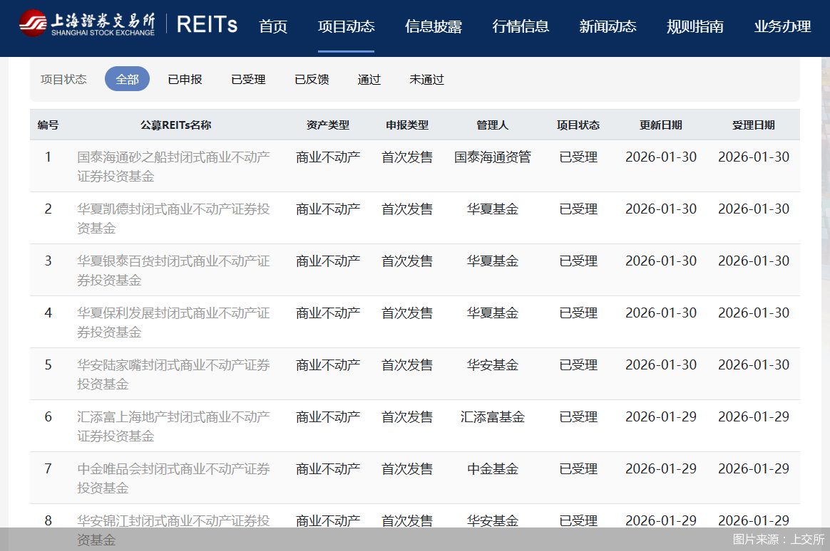 1月29日—30日,首批8单商业不动产REITs项目获上交所受理。其中,华夏基金申报了3单,华安基金申报了2单,汇添富基金、中金基金和国泰海通资管则各申报了1单。项目资产形态包括商业综合体、商业零售、商业办公楼等商业不动产。