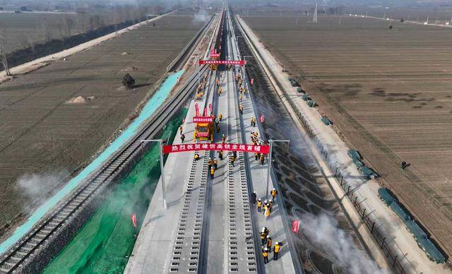 2月1日上午,河北省保定市顺平县,雄忻高铁跨京广铁路特大桥上,随着首对500米长钢轨平稳、精准铺设在无砟道床,雄忻高铁正式进入铺轨施工阶段。