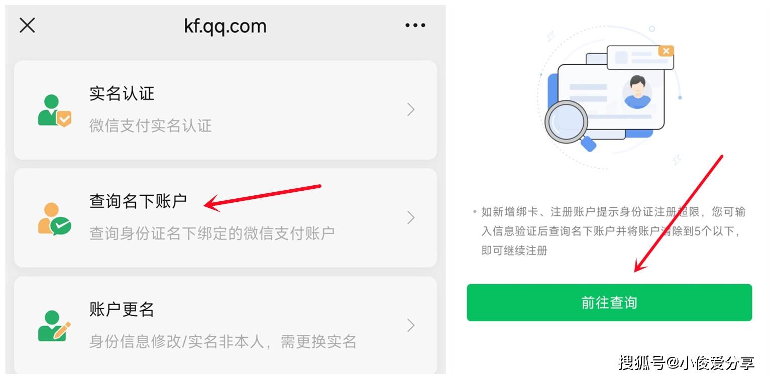 打开微信点【服务】→ 点【钱包】→ 拉到最下面点【客服中心】→ 点【消费者保护】→ 再点【帮助中心】→ 找到【实名问题】点进去 → 点【查询名下账户】→ 再点【前往查询】,然后输入你的姓名和身份证号,点下一步,就能看到用你身份证实名的所有微信账户了。