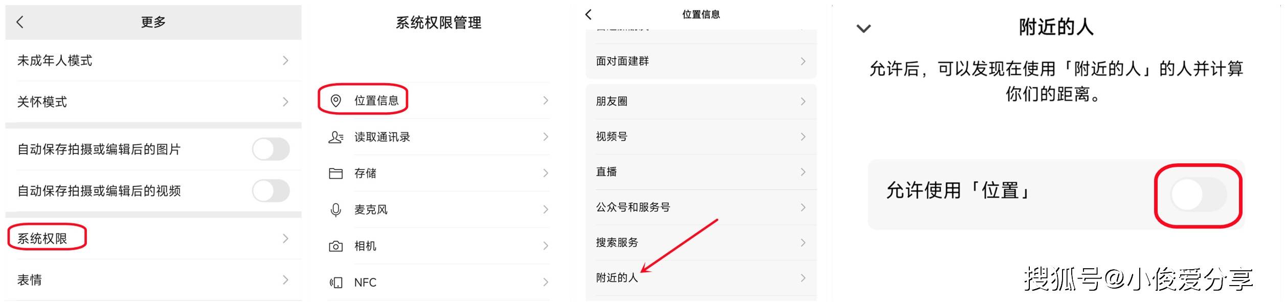 点【设置】→ 【更多】→ 点【系统权限管理】→ 再点【位置信息】,往下滑找到【附近的人】,点开之后,把【允许使用位置】后面的开关直接关掉,这样就再也不会被别人通过附近的人定位了,位置隐私直接拉满。