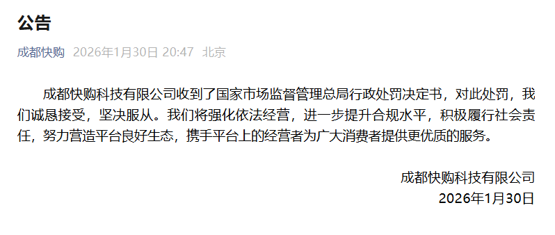 对此,成都快购科技有限公司回应称,公司收到了国家市场监督管理总局行政处罚决定书,对此处罚,公司诚恳接受,坚决服从。公司将强化依法经营,进一步提升合规水平,积极履行社会责任,努力营造平台良好生态,携手平台上的经营者为广大消费者提供更优质的服务。
