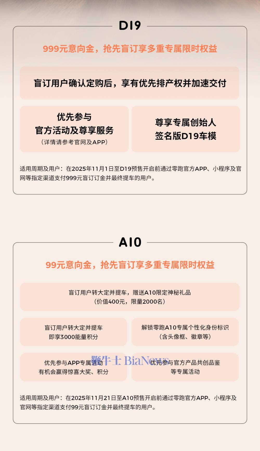 新车盲订层面,零跑D19与A10分别设置不同门槛与权益。
