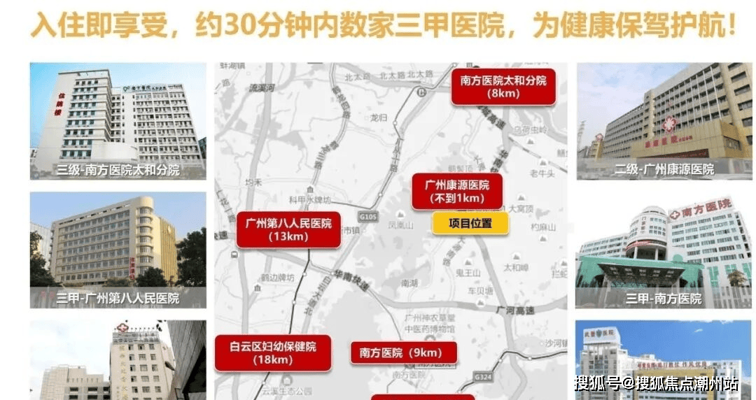 医疗配套三甲医院友好医院就在家门口。距离项目不到1公里内有一所二级的广州康源医院,8km有三级南方医院太和分院。