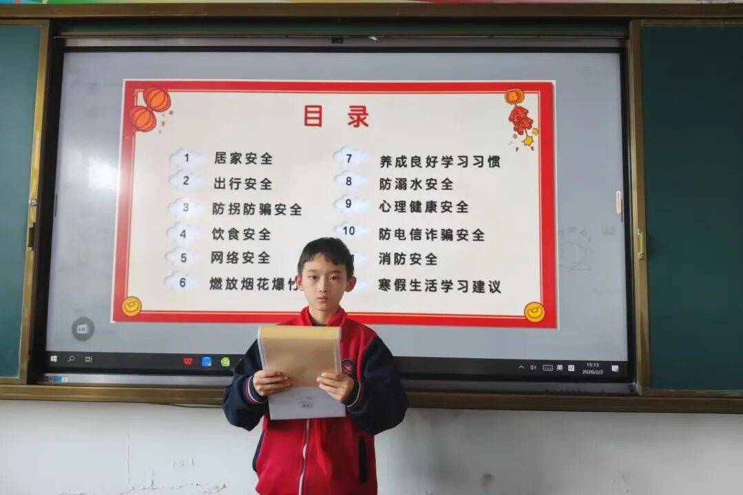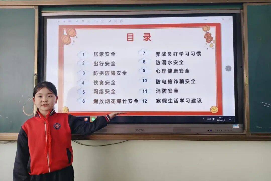 高年级学生独立意识增强,班会以“深度化、系统化”为导向,强化安全责任与综合防护能力。班主任围绕网络安全、公共秩序、应急处置等重点内容,开展专题讲解与案例分析。通过剖析网络诈骗、校园欺凌等典型案例,引导学生规范上网行为,不透露个人信息、不点击不明链接、不参与不良网络互动;针对外出旅行、公共场所活动等场景,强调“知去向、知归时、知同伴”的出行原则,以及人流拥挤时的避险技巧。同时,班会融入心理健康与传染病防控知识,鼓励学生合理安排假期生活,保持规律作息与良好卫生习惯,防范冬季常见传染病。