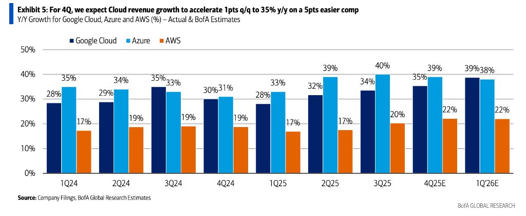 美银预计,四季度单季资本开支将达292亿美元,环比增长22%,同比增长105%;同期自由现金流预计为117亿美元,同比下降53%,占净营收的12%。尽管资本开支强度持续提升,考虑到谷歌在AI领域的广泛布局及云业务的扩张需求,分析师认为其资本配置效率仍优于同业,其中内部AI能力依托TPU体系可能形成一定的成本优势。