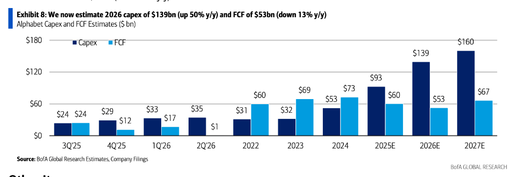 受Meta大幅上调资本开支指引的影响,美银将Alphabet 2026年资本开支预期上调14%至1390亿美元,显著高于市场预期的1190亿美元。