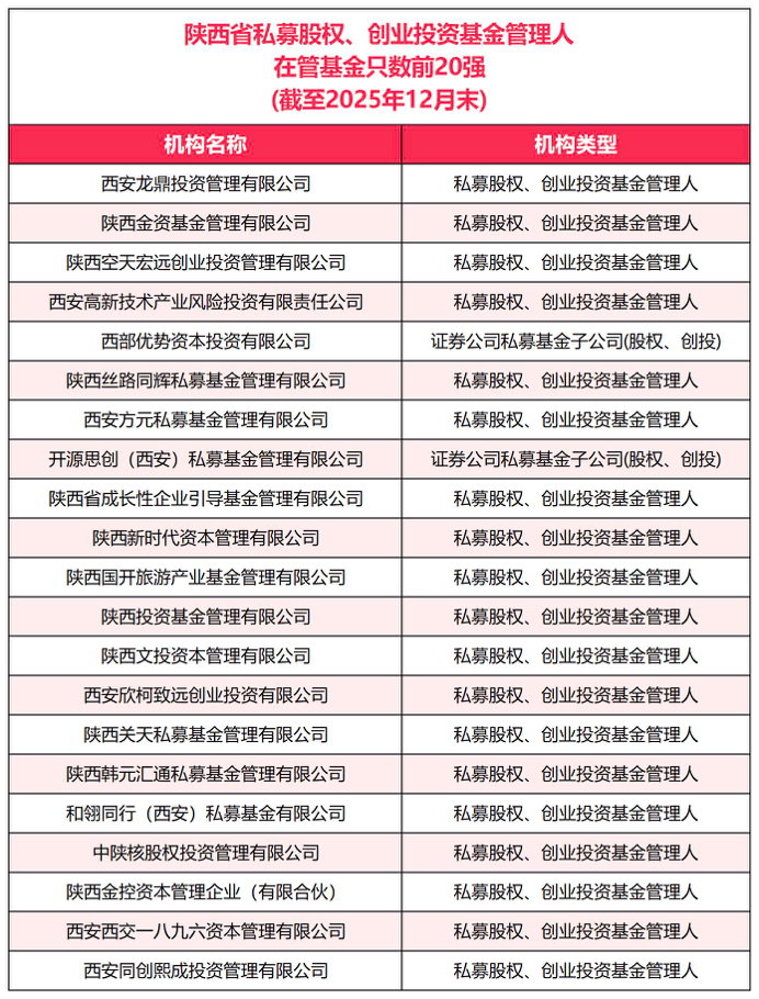 上证报中国证券网讯(记者 张问之)近日,陕西省证券投资基金业协会在“回望征程 聚智启新”跨年学术演讲暨迎新春座谈会上发布了2025年陕西私募股权、创业投资基金管理人20强名单。 据悉,陕西省证券投资基金业协会根据中国证券投资基金业协会数据,全面系统梳理了省内私募投资基金管理人发展全景,分股权、创投和证券投资两大类,以“在管基金规模”与“备案基金数量”双维度指标,特发布最新“陕西省私募股权、创投基金管理人20强名单”。 截至2025年12月末,陕西省私募股权、创业投资基金管理人在管基金规模前20家管理人在管基金规模总计达到702亿元,占陕西私募基金备案总量的61.30%;在管基金只数前20家管理人在管基金数量共344只,占陕西私募基金备案总量的44.27%。 陕西省证券投资基金业协会表示,未来,协会将建立发布机制,持续记录本土资本力量成长轨迹,聚焦头部机构运营实力,映射陕西股权投资行业风向标,为政府决策、产业引资、机构合作提供数据支撑。