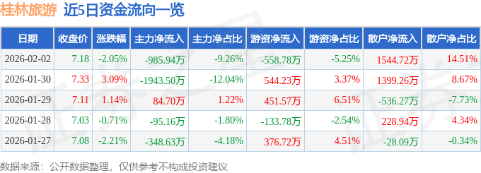 证券之星消息,截至2026年2月2日收盘,桂林旅游(000978)报收于7.18元,下跌2.05%,换手率3.12%,成交量14.6万手,成交额1.06亿元。