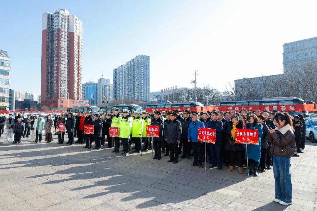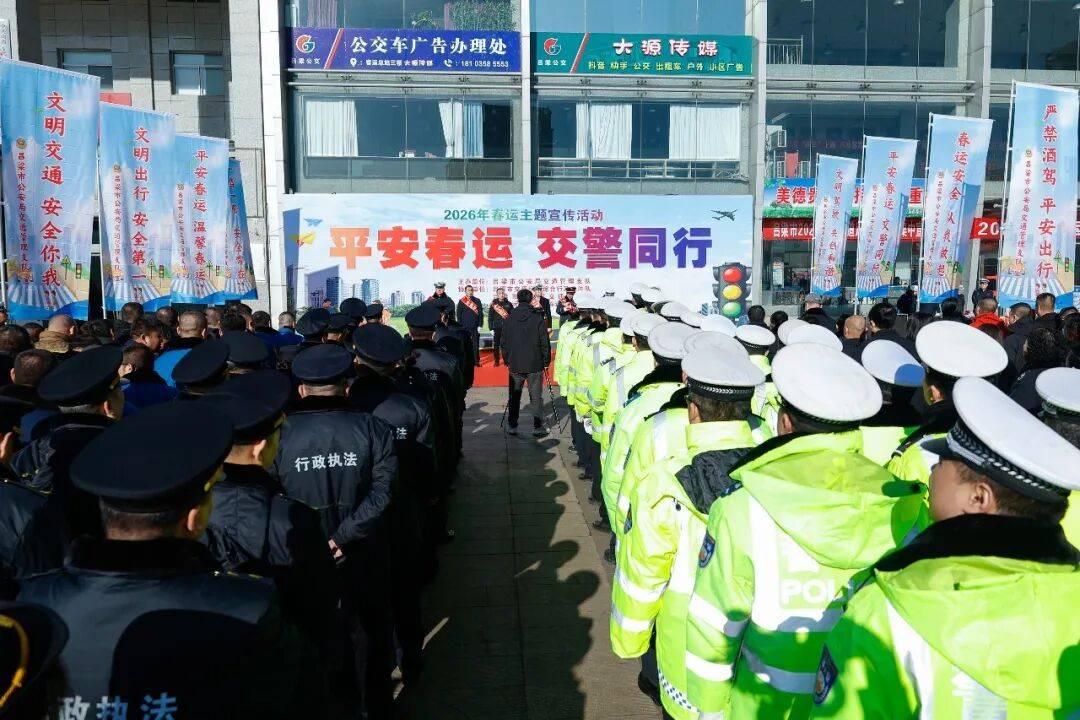 2月2日上午,春运首日,吕梁市公安局交通管理支队联合吕梁市交通运输综合行政执法队、吕梁市离石区交通运输局、山西汽运集团吕梁汽车运输有限公司,共同举办2026年春运道路交通安全主题宣传活动。本次活动以 “平安春运、交警同行” 为核心主题,标志着为期40天的2026 年春运保障工作正式全面启动。客货运车驾驶人、驾校学员、客运总站、公交公司、出租公司等多方代表齐聚现场,共同为春运安全护航。