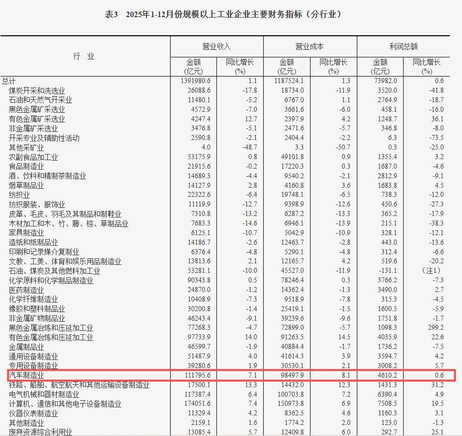 另一个严峻的事实是,中国汽车行业的销售利润率根本达不到5%,2025年的利润率仅为4.1%,利润总额同比微增0.6%。