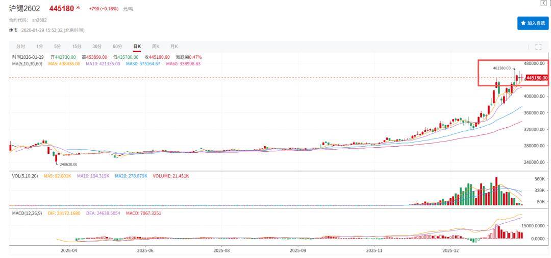 此外,还有一种原材料上涨幅度惊人,那就是锡金属。目前沪锡2602的价格在44万元/吨左右,要知道2025年2月份时,这一数字在25万元/吨。