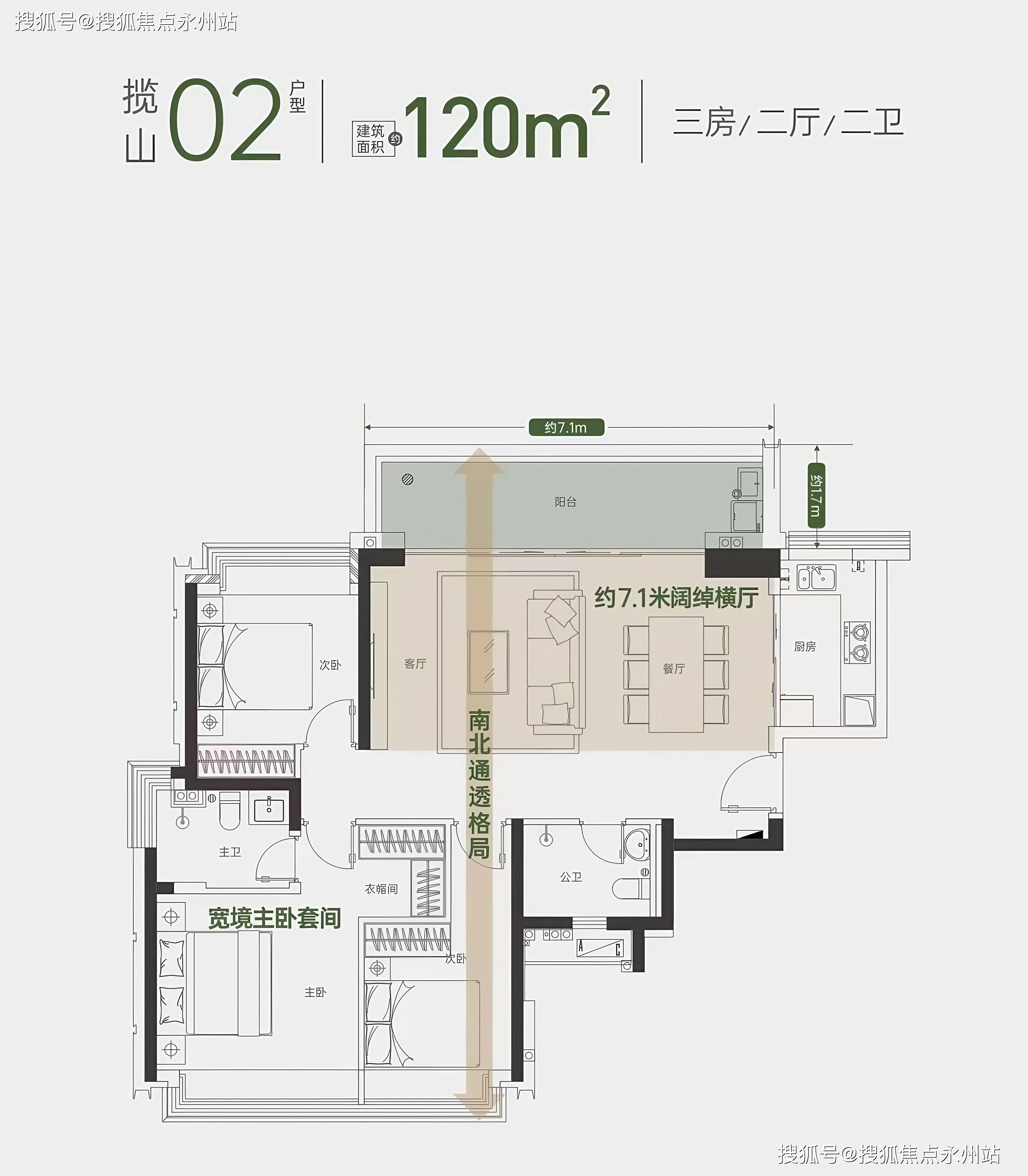 建面约120㎡户型:有两种经典设计。其一为3房2卫横厅格局,客厅阳台超 7.1 米,尺度感十足,可俯瞰小区园林与塘朗山山景,动静分离且户型方正,视野开阔。从2层起北向视野便绿意盎然,20层以上能俯瞰整个塘朗山,东南向更能兼得山景与城市繁华。