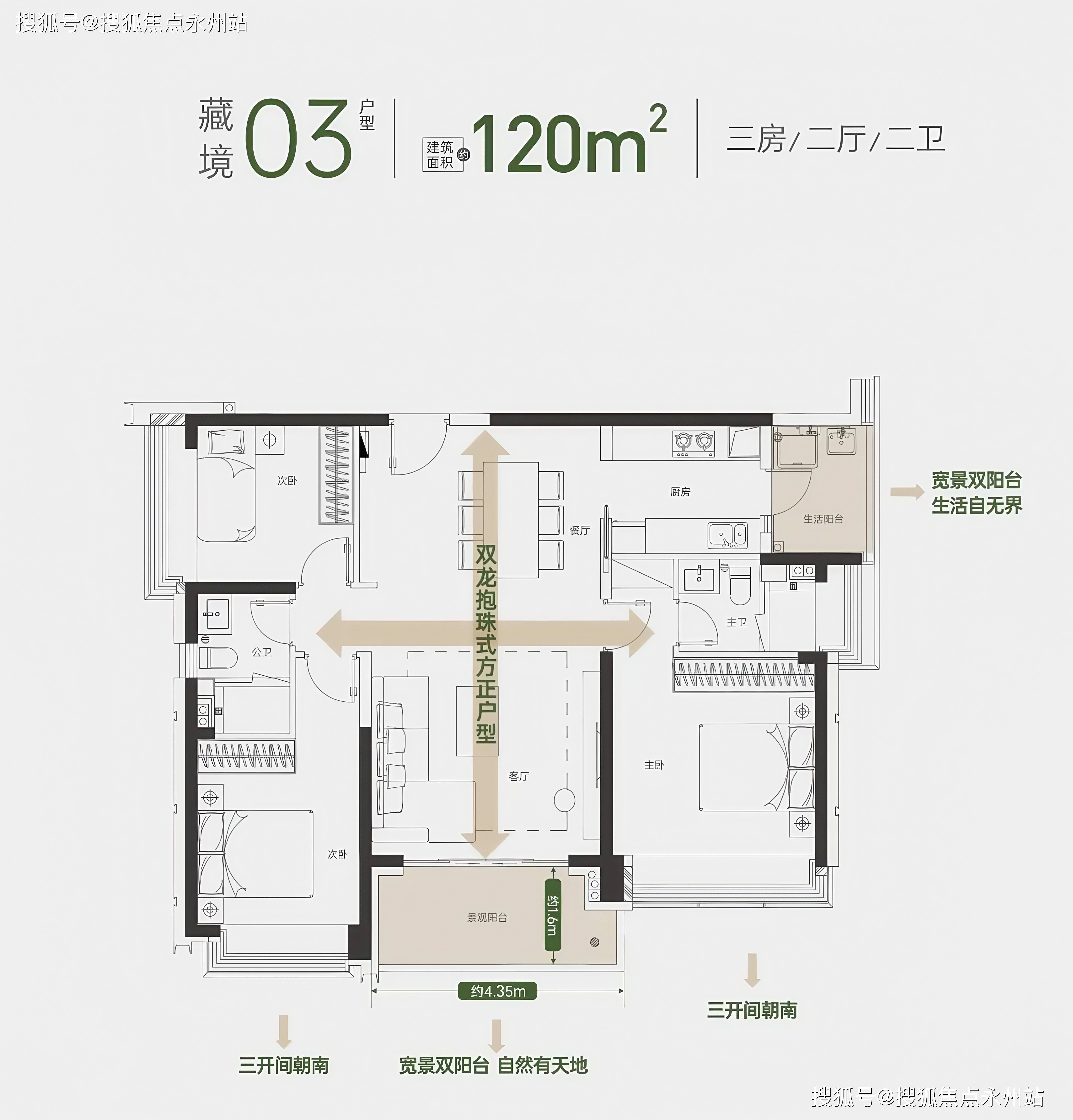 其二为“双龙抱珠”户型,三开间朝南,双阳台设计,正南朝向,户型方正,能实现三面宽采光。中庭为厅,主客卧分布两侧,既提高空间利用率,又保障居住私密性。主卧套房设计,带观景浴室;主阳台进深约 1.5 米,拥有 270° 向外视野景观,可俯瞰安托山;生活阳台连接双面操作厨房,还能观赏塘朗山景观。