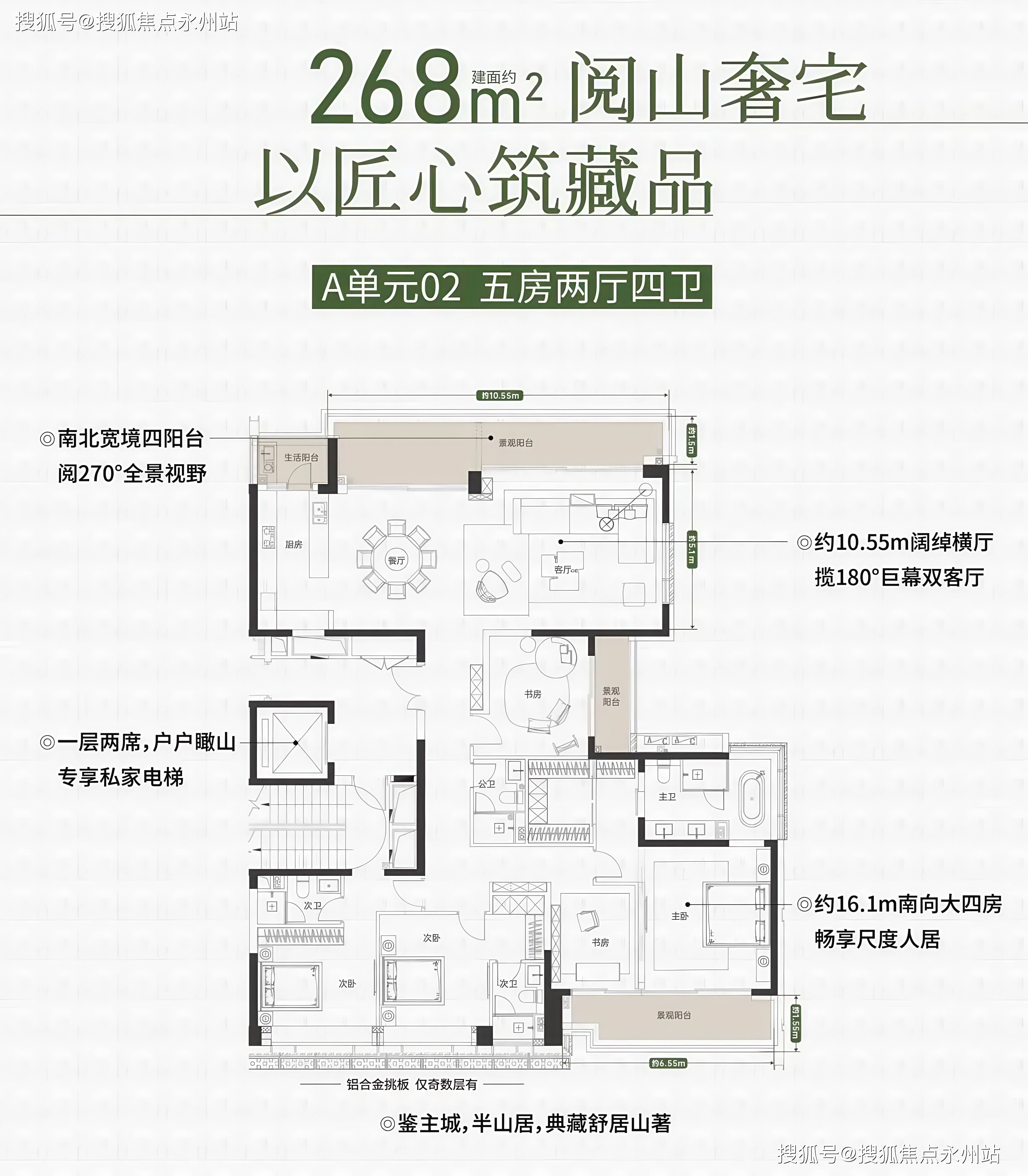 建面约193-268㎡大平层户型:以建面约268㎡户型为例,为五房四卫三套间设计,动静分区合理。南北通透,每个卧室均配备大飘窗,窗宽与开间基本一致,南北四阳台设计打造 270° 全景视野,将周边景观资源引入室内,主卧配置瞰景阳台,还有约45㎡奢阔主卧,采用套间式、全采光设计,配套步入式衣帽间,舒适度极高。