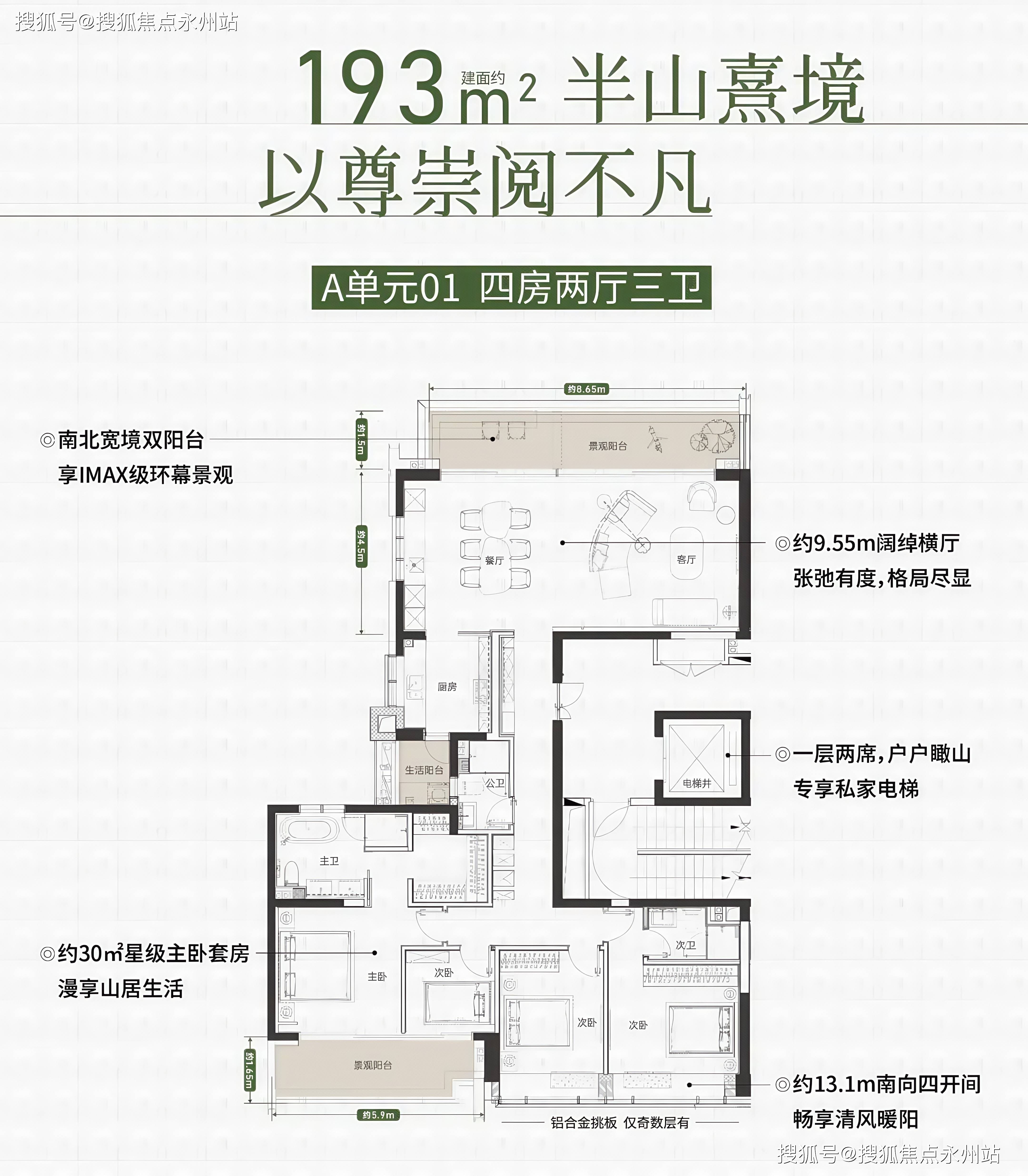 项目推售主力户型为2梯3户的120㎡三房,2梯2户200-268㎡,另有顶层复式户型 面积约300-500㎡,折后单价6.9万/㎡起。
