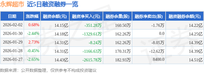 永辉超市融资融券信息显示,融资方面,当日融资买入6376.01万元,融资偿还6727.29万元,融资净偿还351.28万元。融券方面,融券卖出2.58万股,融券偿还4.34万股,融券余量160.5万股,融券余额711.01万元。融资融券余额14.22亿元。