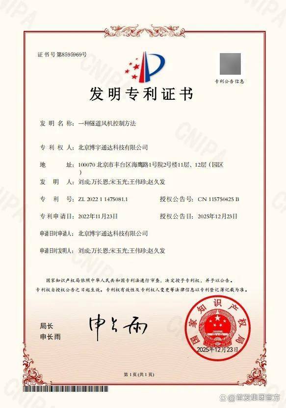 云星宇公司所属博宇通达公司的发明专利“一种隧道风机控制方法”获得国家知识产权局授权并取得发明专利证书。