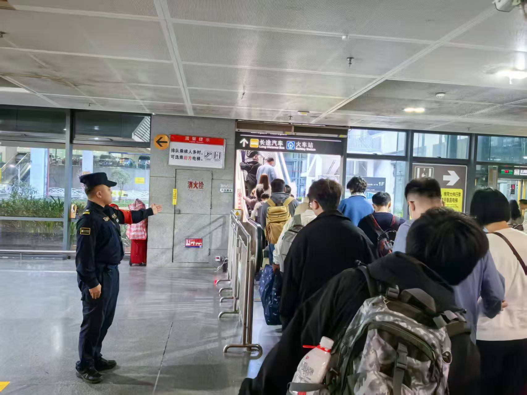 记者了解到,深铁集团针对交通枢纽去程客流高峰设置进站缓冲区,并结合客流特点适时调整电扶梯的客流方向,在电扶梯等客流集中处设立专人值守,强化安全防守力度。同时在地铁换乘高峰时段,启用“长走行通道+绕行铁马”方案,日均增派300名专人引导客流。针对返程客流,各交通枢纽已协同联勤单位形成应急联动,有效应对列车晚点大客流等各类应急事件,全时段为市民提供服务保障。