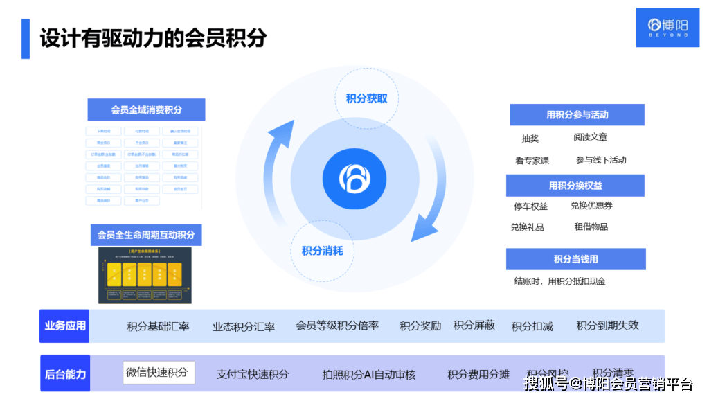 博阳购物中心会员系统,整合线上线上商场会员资源,构建全渠道统一的会员体系、会员权益体系和积分体系,聚合支付支持积分抵扣、卡券核销,实现商场与商户分润,实时计算消费积分;通过会员商场小程序、购物中心会员小程序,为会员提供更个性化、更优质的会员服务,例如停车、商圈积分、物品租借、到家服务等。在会员标签体系和会员画像的基础上,以小程序、企微、公众号、短信多触点,实现一对一精准沟通,线上线下一体化运营,提升会员复购频次和客单价。