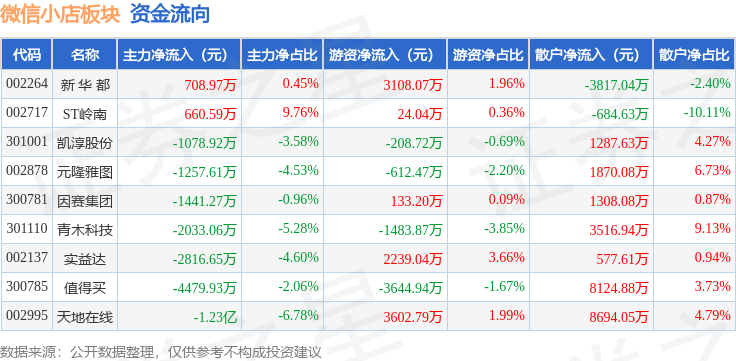 从资金流向上来看,当日微信小店板块主力资金净流出2.4亿元,游资资金净流入3157.13万元,散户资金净流入2.09亿元。微信小店板块个股资金流向见下表: