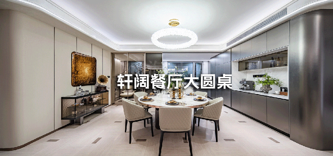近56㎡奢阔客餐厅打破传统功能分区,无论家庭聚会、朋友欢聚还是商务洽谈,都能轻松应对。