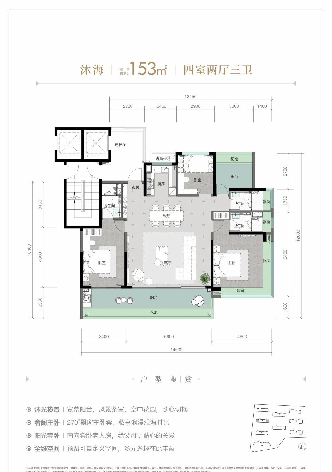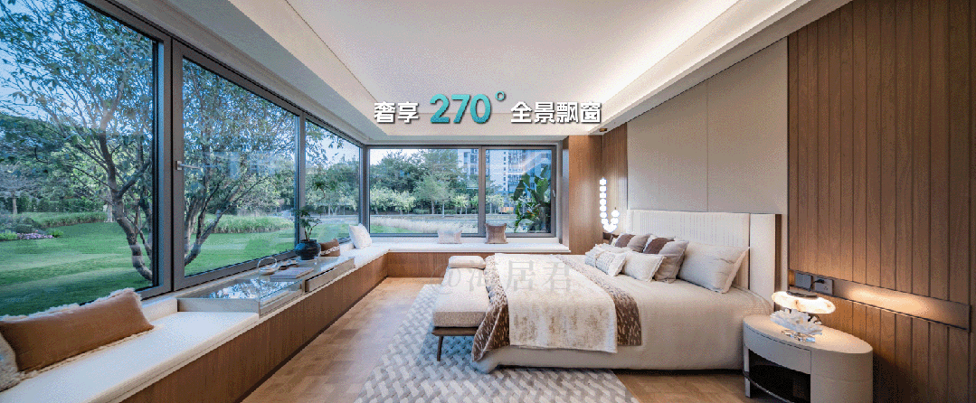 规划建筑面积约126-213㎡观海奢装大平层,约3.1米阔绰层高,部分户型创新设计270°全景飘窗主卧套。