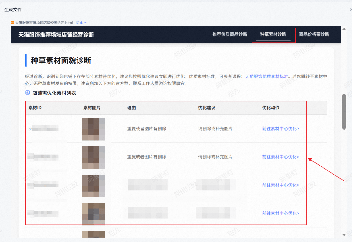(推荐商机种草素材诊断界面,注:产品逐步迭代中,页面样式后续可能升级 )