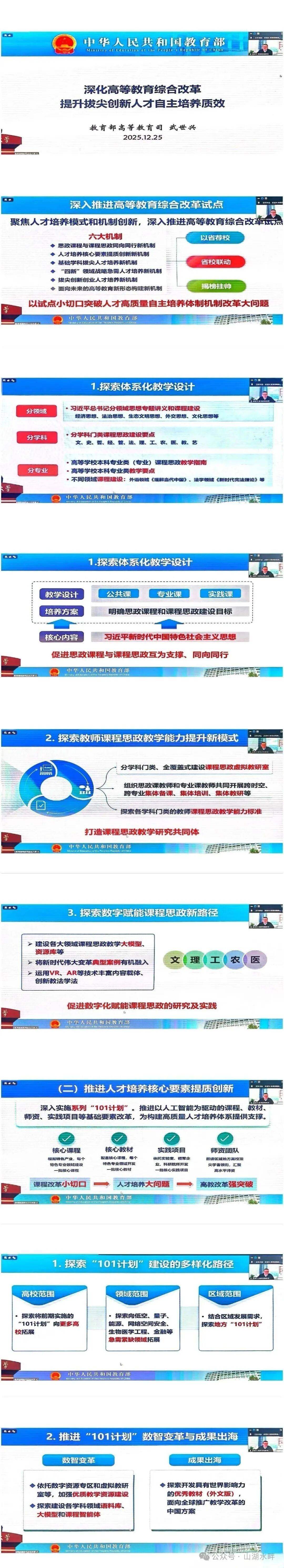 二是要推进人才培养核心要素提质创新,深入实施系列“101计划”,以核心课程建设带动教材、实践项目及师资团队建设,以课程改革小切口解决人才培养大问题,实现高等教育改革强突破。“下一步,我们将拓展‘101计划’实施范围与路径,向更多高校、急需紧缺领域扩展。”武世兴表示,结合区域高等教育发展需求,探索地方“101计划”,依托数字资源专区和虚拟教研室等加强优质教学资源建设,包括各个学科领域的语料库、大模型和课程智能体等。在此基础上,拓展高等教育世界影响力,推广优秀经验,让“101计划”的成果惠及更多高校和学生。