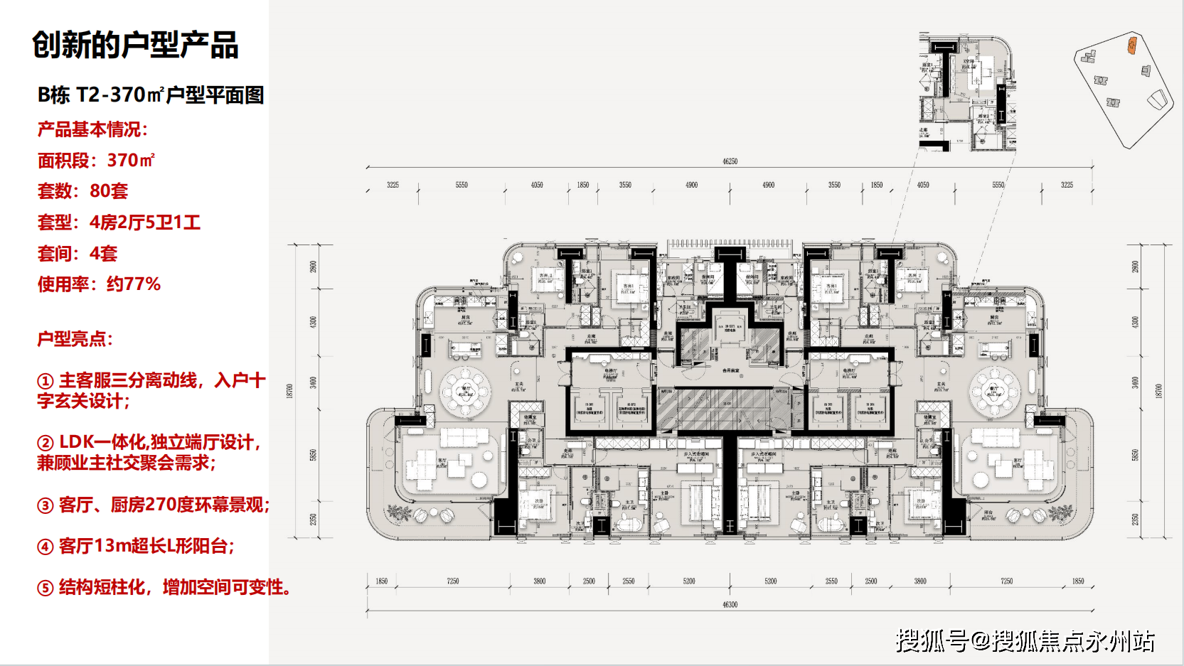 370㎡四房五卫+家政套间:这个户型是相当通透的户型,格局非常顶豪。分布在B栋47F,5梯2户,每层层高3.6米,设计了独门独户的入户空间。