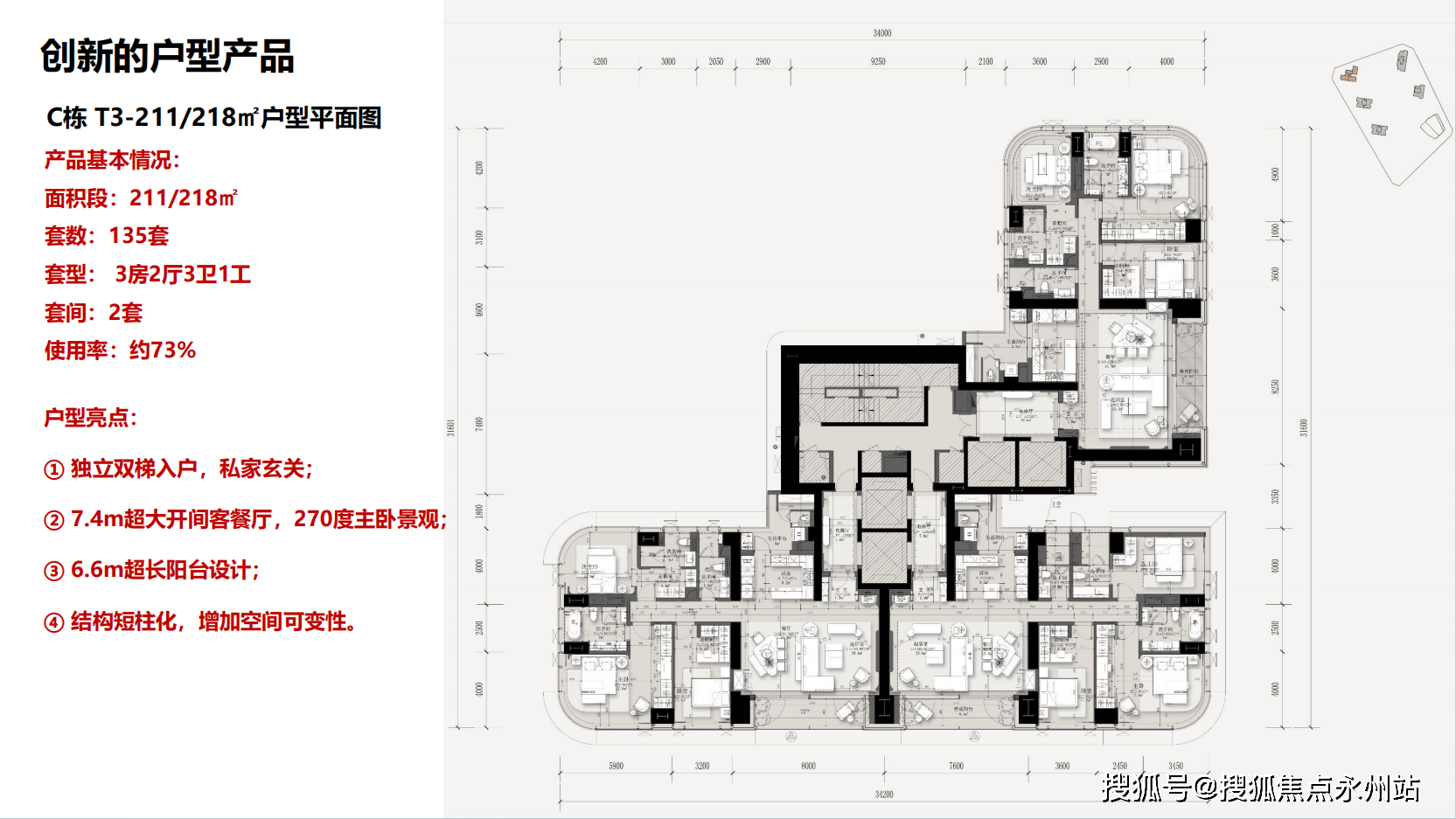 211-218㎡三房三卫+家政套间:首先我们看最起步的户型是约211-218㎡三房三卫+家政套间,分布在C栋,4梯3户51F超高层,每层层高3.3米,都有专梯入户。这是在小区最靠里边的位置,是有遮挡的景观。